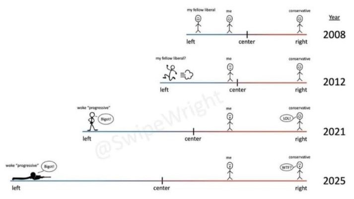 I like to think of myself as an “eighties liberal”, which today, is automatically conservative simply due to liberals extreme movement to the far left. This well-known cartoon below describes many liberal’s experience in the last 20-30 years.